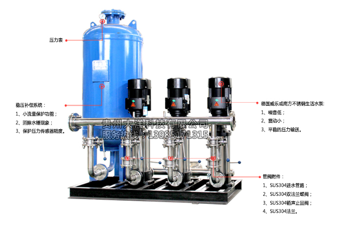 - 恒壓供水設備由氣壓罐、水泵及變頻控制柜三部分組成,變頻恒壓供水系統設定參數,通過微機控制變頻器的輸出頻率從而自動調節水泵電機的轉速,實現管網水壓系統自動恒穩于設定的壓力值:即用水量增加時,頻率升高,水泵轉速加快,供水量相應增大;用水量減少時,頻率降低,水泵轉速減慢,供水量亦相應減小,這樣就保證了供水效率用戶對水壓和水量的要求,同時達到了提高供水品質和供水效率的目的,“用多少水,供多少水”;采用該設備不需建造高位水箱,水塔,水質無二次污染,是一種理想的現代化建筑供水設備。設備還具有強大的遠程(無線)通信監控功能及用戶中控室(選配);人性化的人機對話觸摸式界面;全人工智能控制及遠程保修預警服務。
